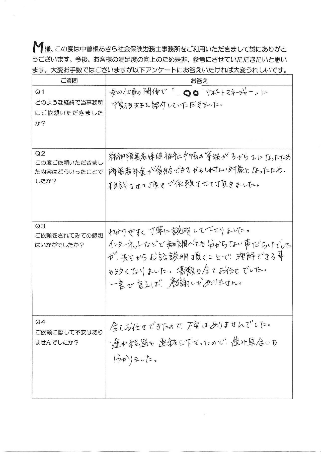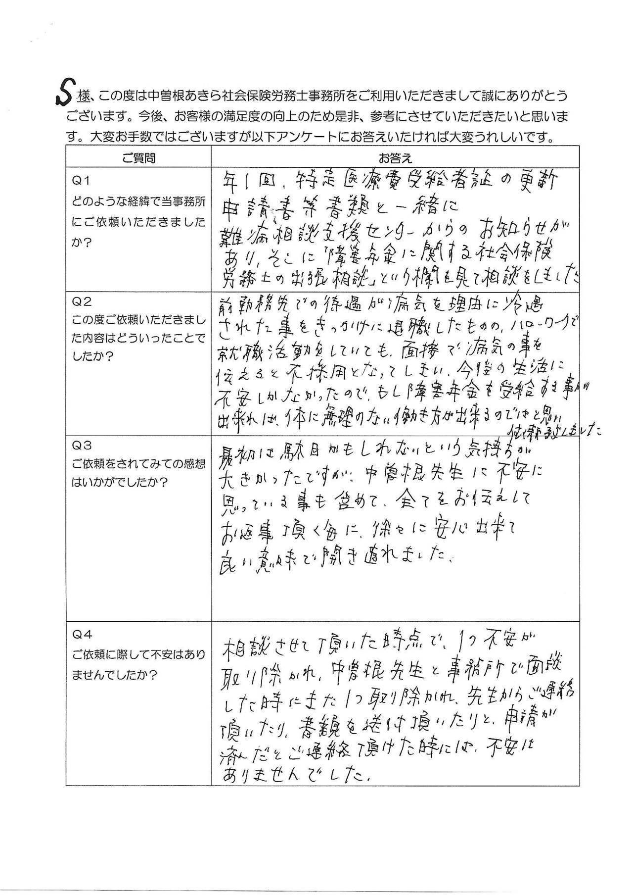 障害者雇用として十分な配慮のある職場内で反復的な軽作業を行っていました。職場の上司に職場での様子をお聞きして上申書を記載していただきました。遡及での障害年金も認められたことで今後の不安が少なくなったとお聞きして安心しました。役所の窓口などで障害年金については社会保険労務士に相談できることを教えてくれると良いのにというご意見をいただき有難く思います。役所や支援者にご紹介していただけるような信頼される士業にならないといけないとあらためて思います。
